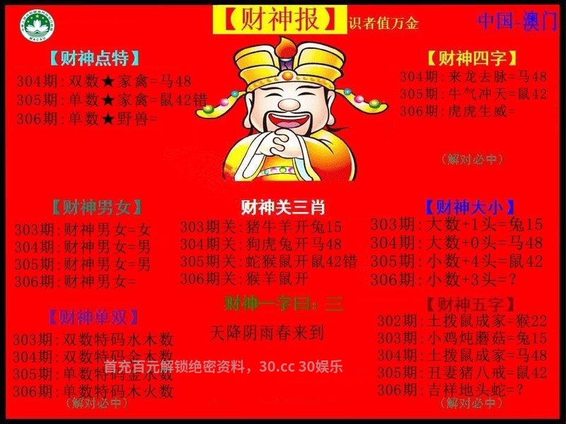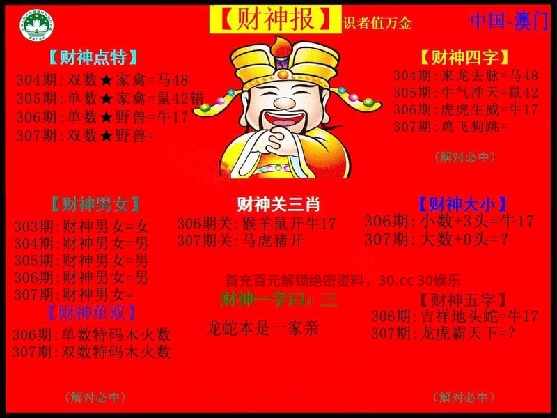 | 306期 | 马 | 3尾 | 2头 | 开牛17 |